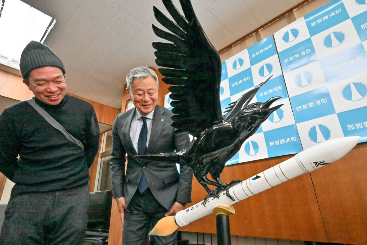 今月25日の3号機目となるロケットカイロス発射成功を願い、ロケット発射場を設けられる那智勝浦町へ八咫烏が導くロケット像を寄贈しました。