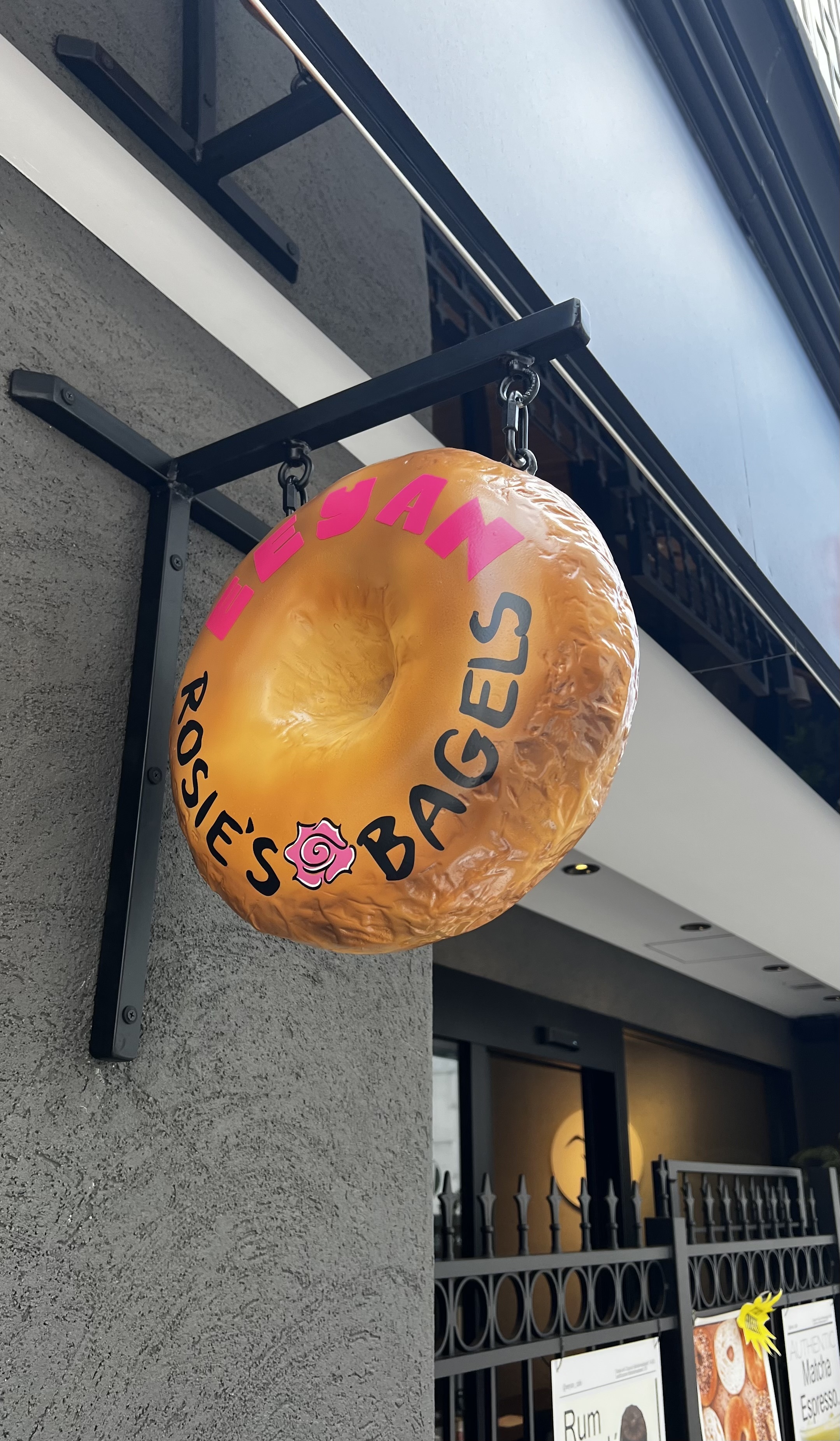 「ROSIE'S BAGELS」の文字と可愛らしいバラのイラスト、そして鮮やかなピンクのアクセントがグレーの壁面に映えて、とってもキャッチーで素敵ですよね!